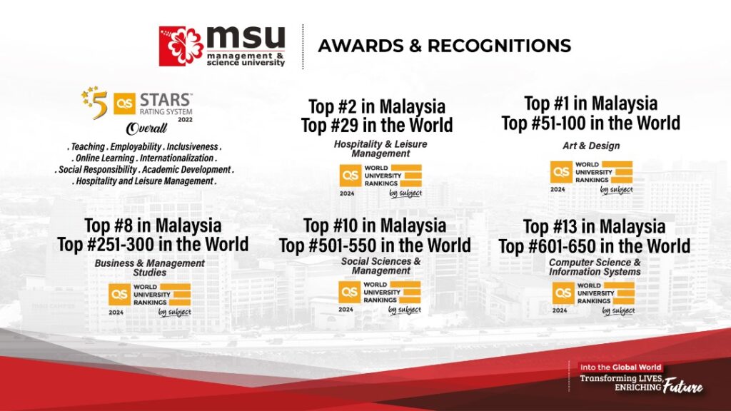 Management and Science University (MSU) is a global multi-ranked institution focused on building holistic human capital. Envisioning a better, more sustainable future for all, MSU champions equality by providing a level playing field across extensive efforts in transforming lives, enriching future.